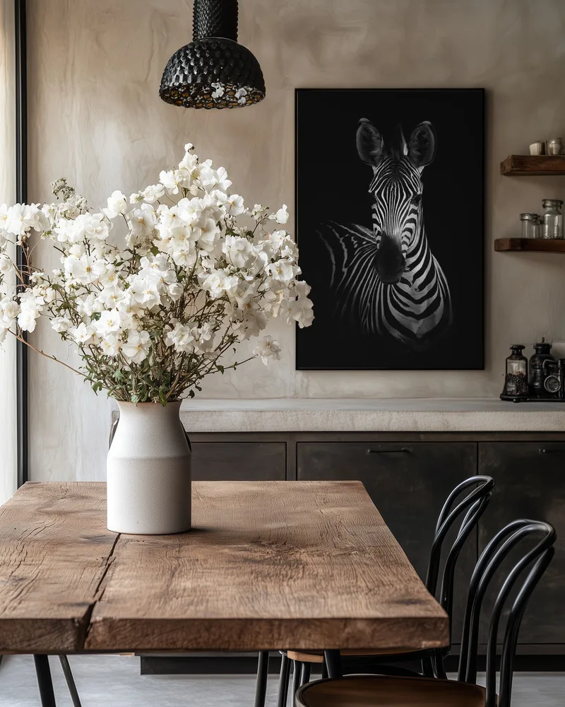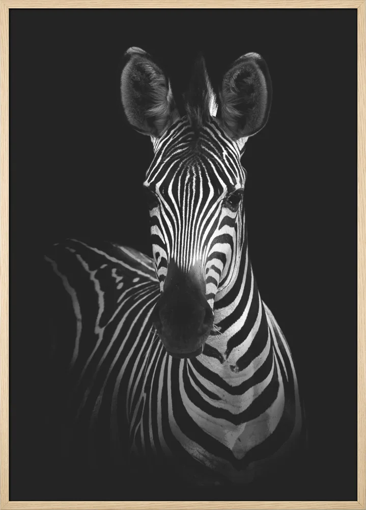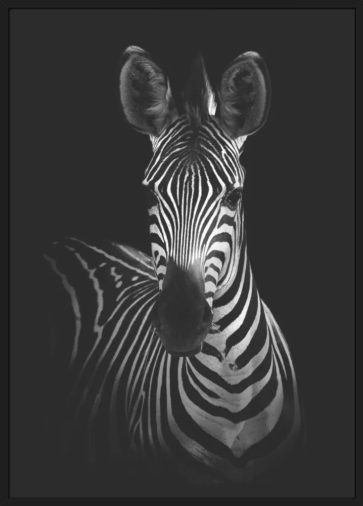 Sort/hvid plakat med zebra i mørke omgivelser. Et elegant og kontrastfyldt dyremotiv.