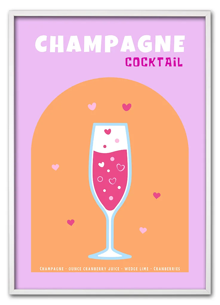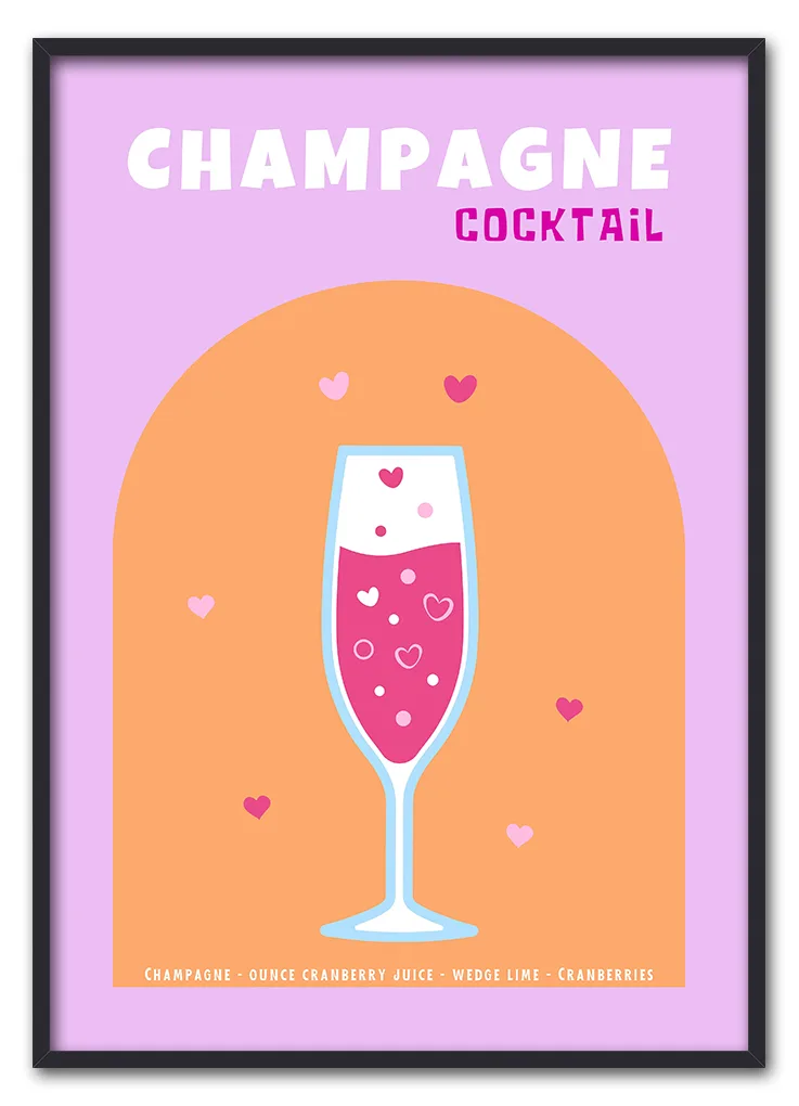 Tipsy Pop – Champagne Cocktail er en sød og festlig plakat med et lyserødt champagneglas omgivet af bobler og små stjerner. Baggrunden er pastel lilla, og stilen er legende og pop art-inspireret. En perfekt plakat til nytår, fødselsdag eller bare til hverdag med lidt ekstra fest. Den fungerer flot alene, men kan også matches med andre farverige drinksplakater for en humoristisk og dekorativ væg.