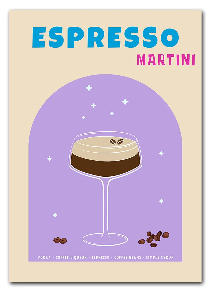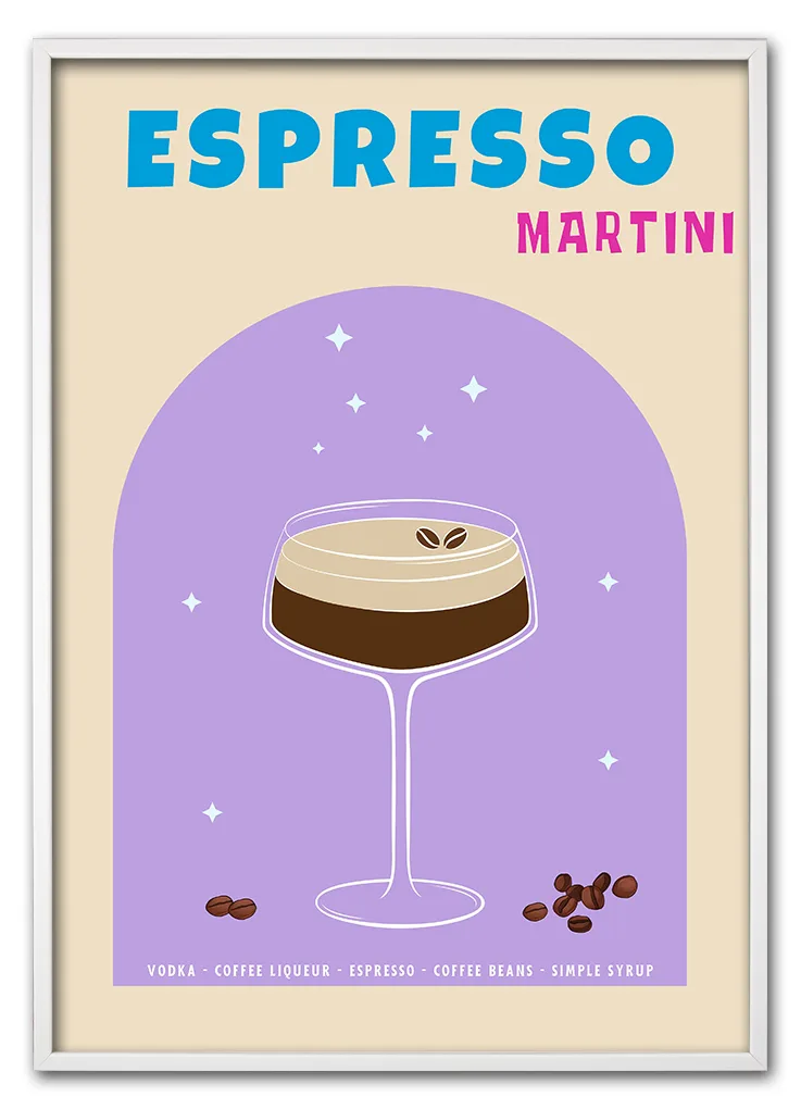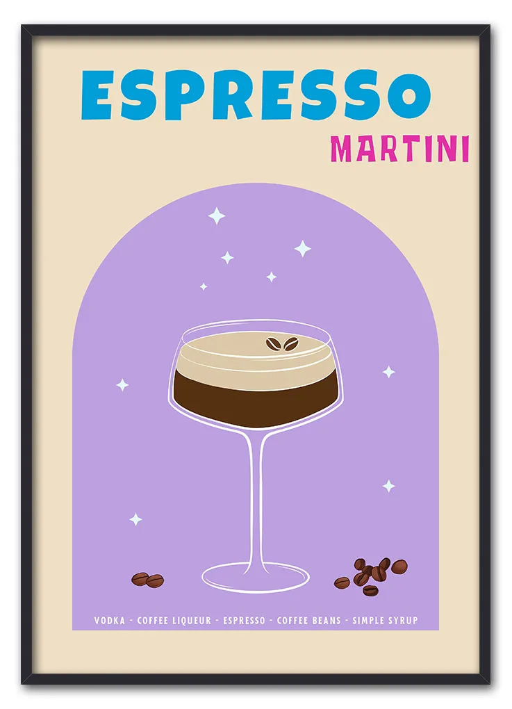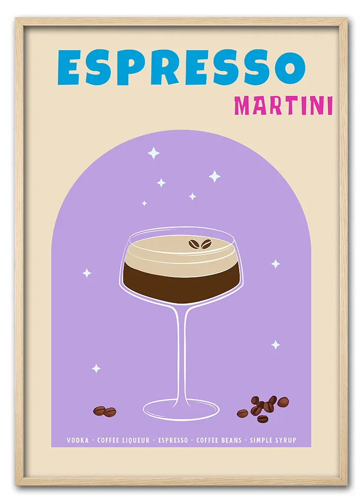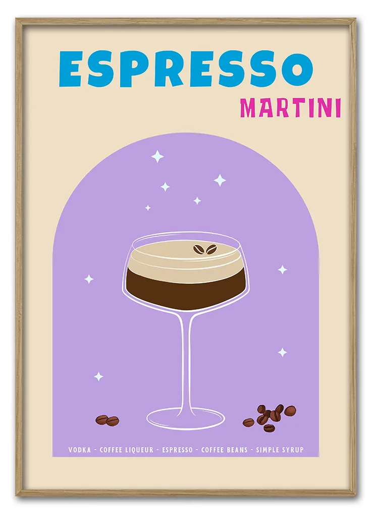 Tipsy Pop – Espresso Martini er en varm og grafisk plakat med den populære kaffecocktail illustreret i brunlige toner på en beige baggrund. Motivet er dekoreret med kaffebønner og små stjerner, som tilføjer et legende twist. Et oplagt valg til dig, der elsker kaffe og cocktails – og helst begge på én gang. Hæng den i køkkenet, kaffehjørnet eller hjemmebaren. En del af Tipsy Pop-serien, der også inkluderer Tequila Sunrise og Gin & Tonic Cocktail.