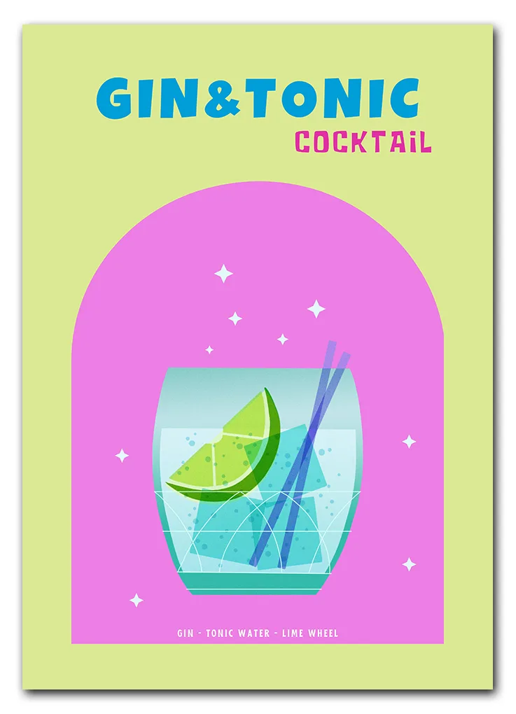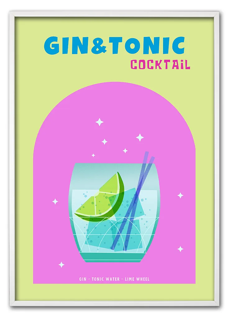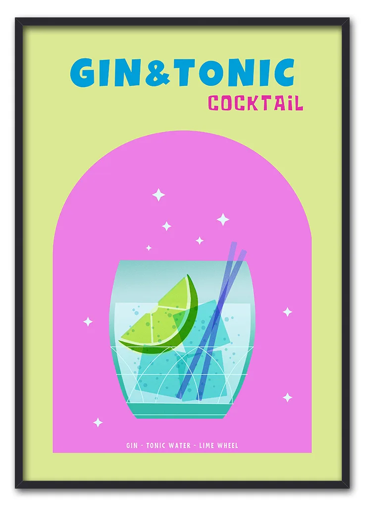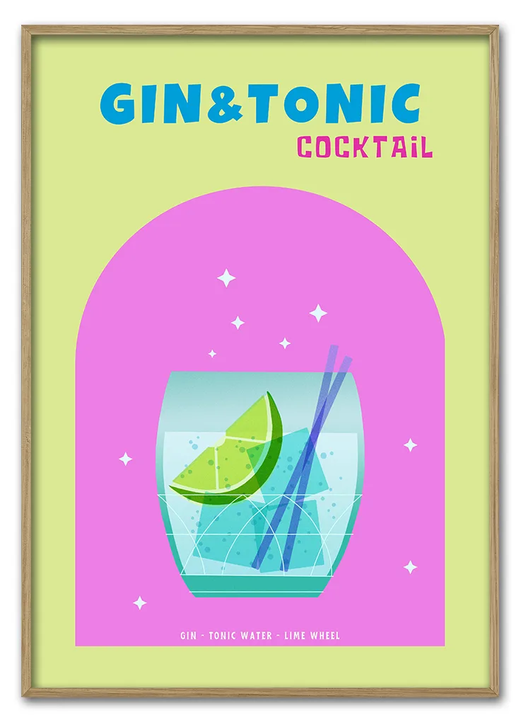 Farverig plakat med Gin & Tonic i pink og limegrøn. Legende og moderne udtryk.