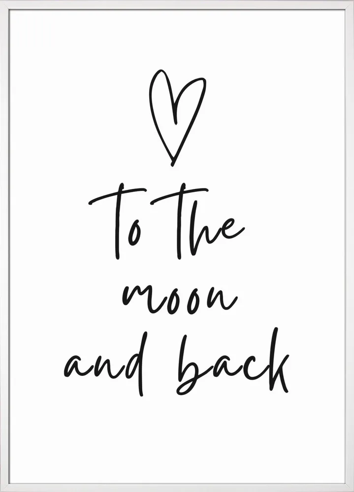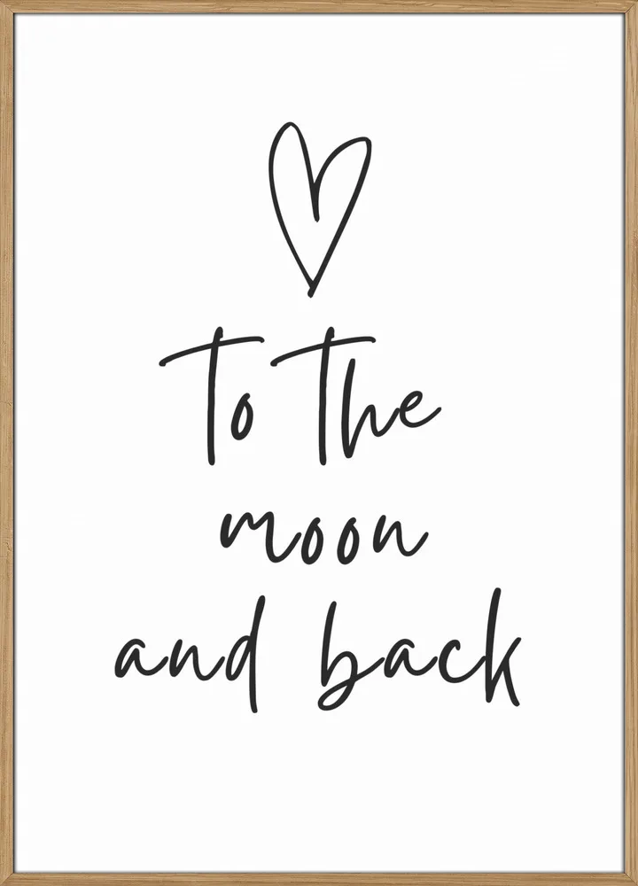 To the Moon and Back af Kristina N. er en klassisk sort-hvid plakat med poetisk enkelhed. Den håndskrevne tekst formidler kærlighed på en ærlig og underspillet måde. Designet passer perfekt i soveværelset, børneværelset eller som gave til en, man holder af. En minimalistisk hyldest til den dybeste form for kærlighed.