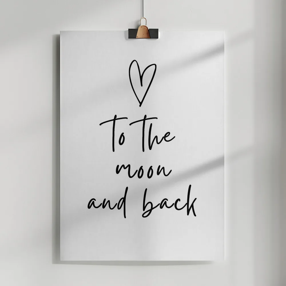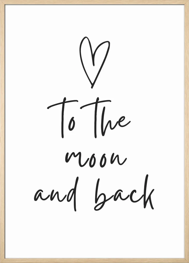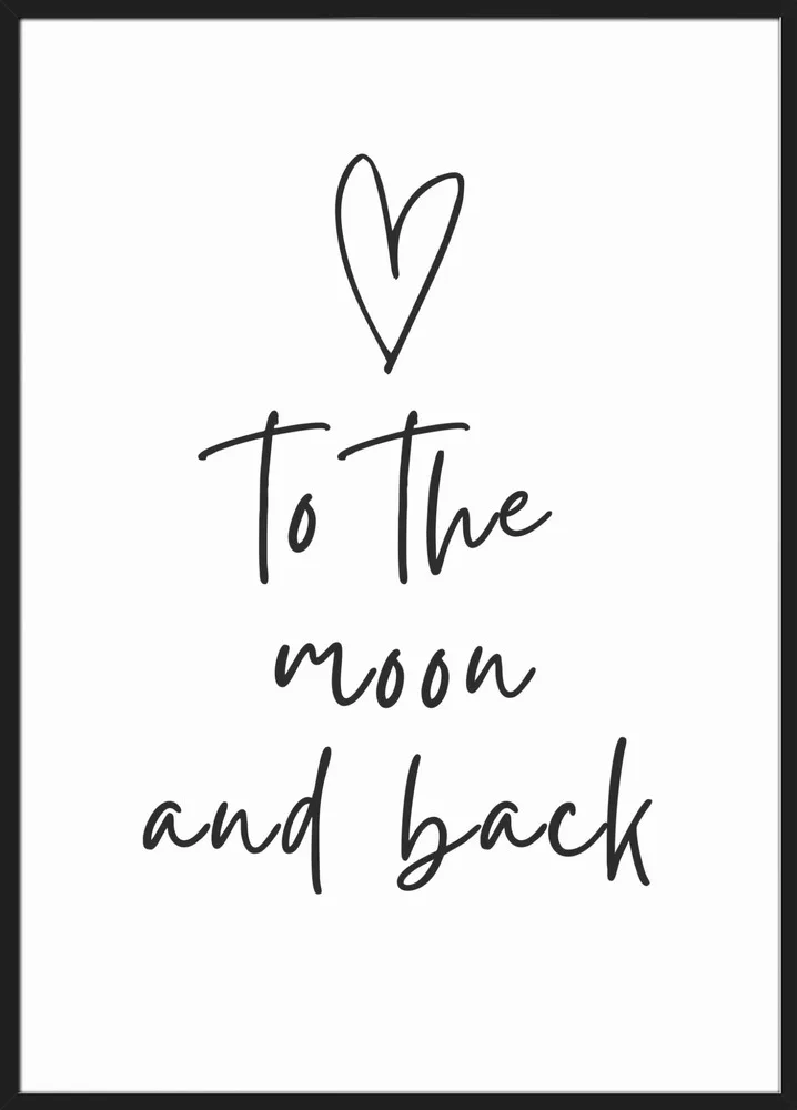 Stilren plakat i sort og hvid med håndskrevet tekst To the moon and back. Et tidløst kærlighedsbudskab.