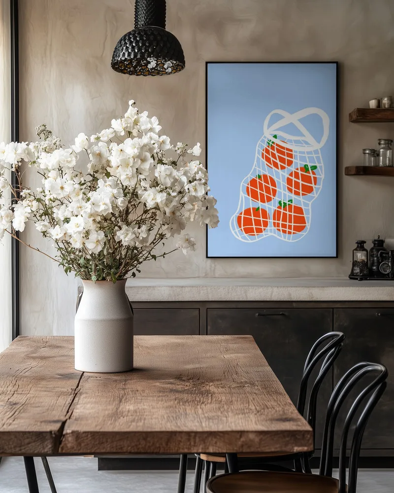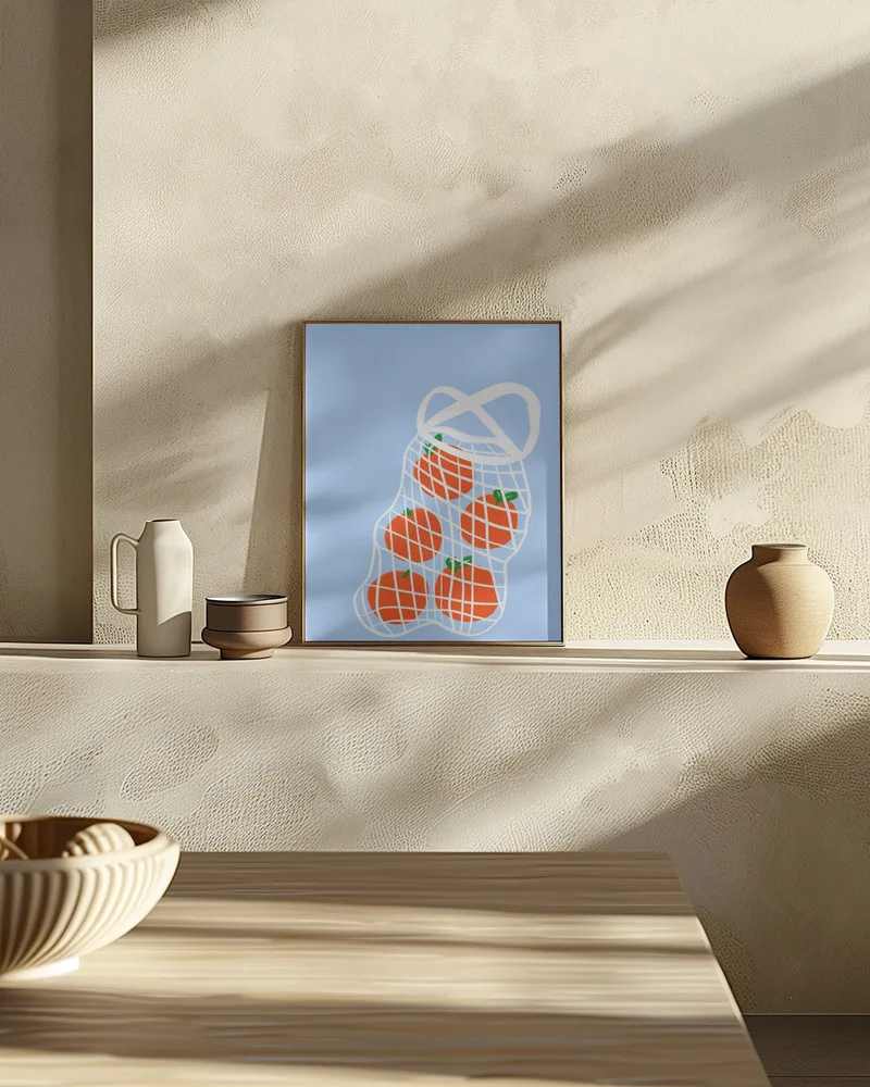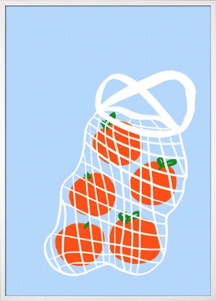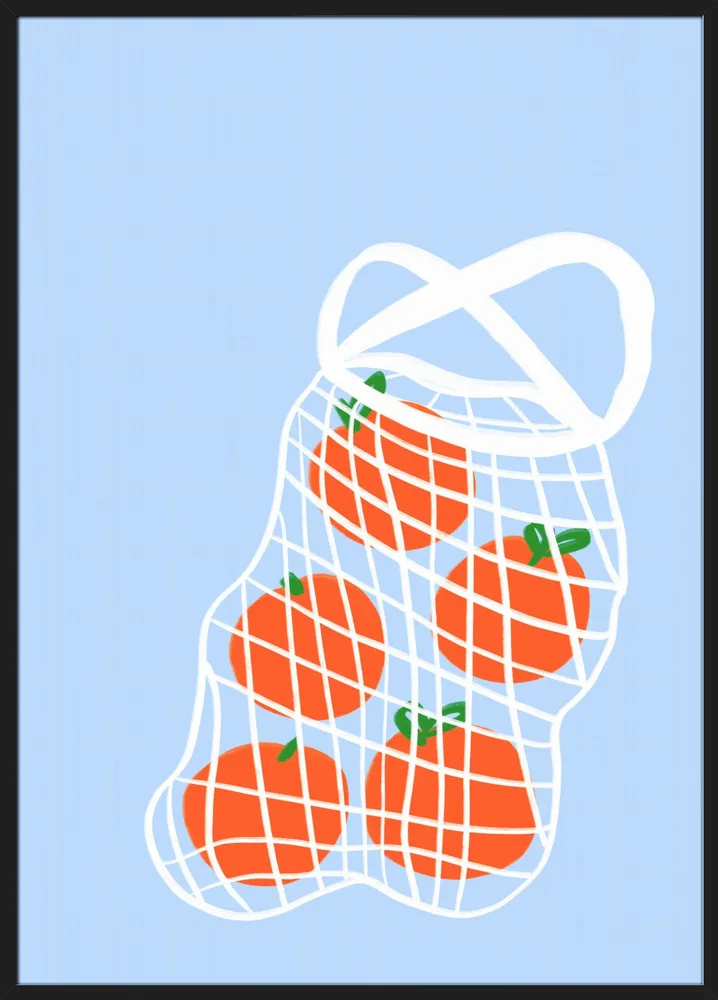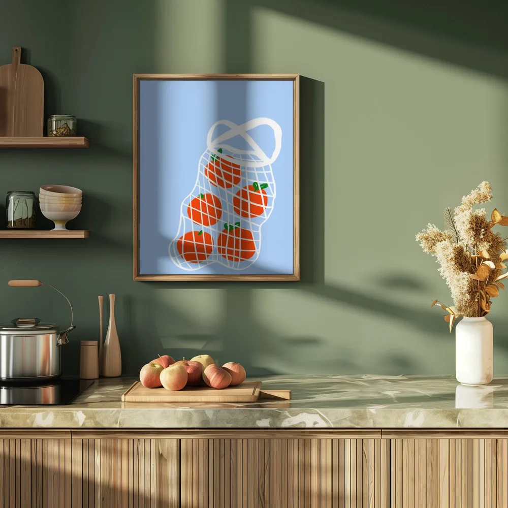 Tomatoes in Mesh af Athene Fritsch er et minimalistisk og stilrent kunsttryk med tydelig reference til moderne grafisk design. De røde tomater står som en klar kontrast til den lyseblå baggrund, og den hvide netpose tilfører struktur og lethed. Motivet passer perfekt i køkkenet eller spisestuen, hvor du ønsker et rent, nordisk udtryk.