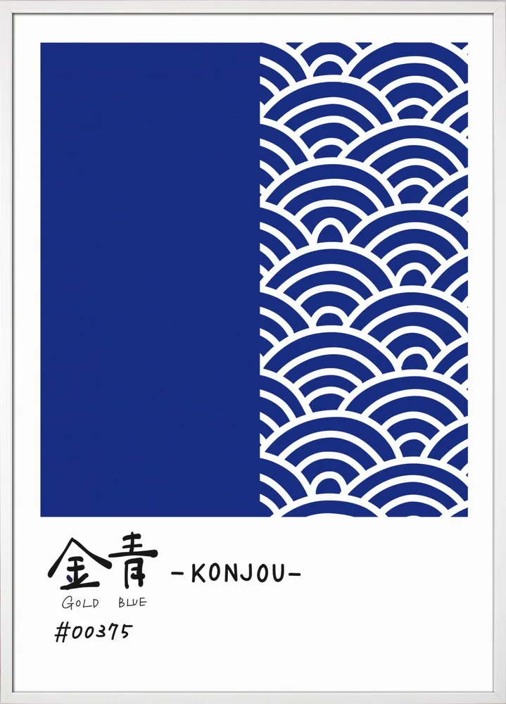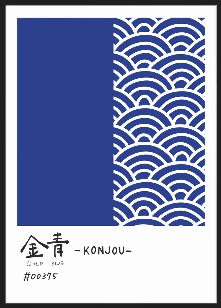 Traditional Japanese Wave Pattern and Calligraphy 2 af Rio Deep Blue forener moderne enkelhed med ældgamle symboler. De gentagne blå bølger repræsenterer havets kraft og bevægelse, mens kalligrafien tilfører et kulturelt præg. Motivet er ideelt til minimalistiske hjem eller kontorer, hvor man ønsker et rent, balanceret udtryk med tydelig japansk reference.
