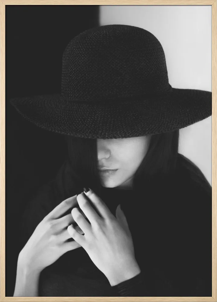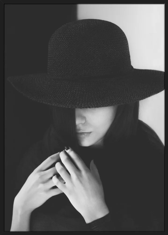 Sort/hvid plakat af kvinde i hat og mørkt tøj. Et stilrent og mystisk motiv med klassisk elegance.