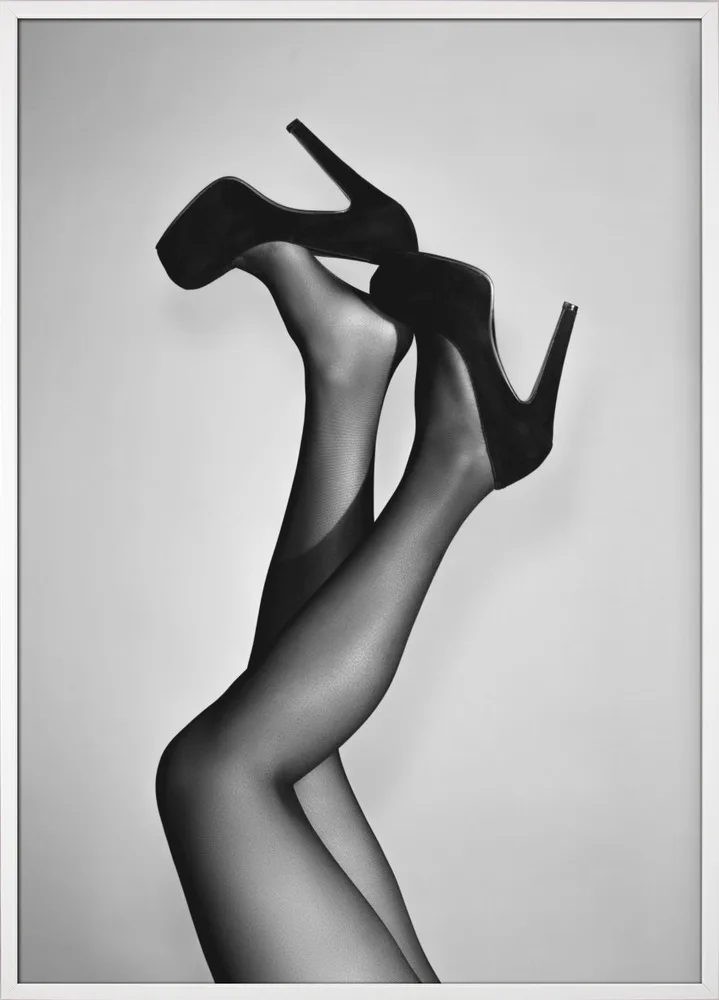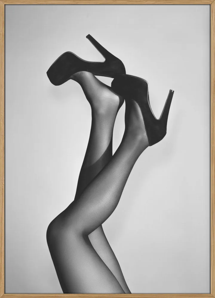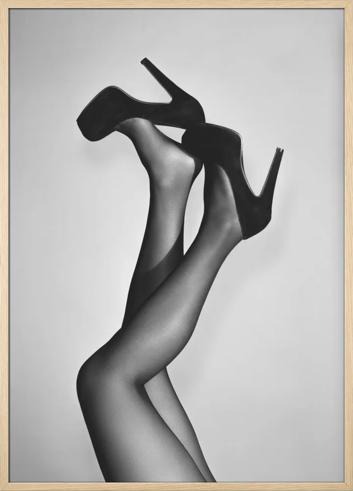 Sort/hvid plakat af ben i stiletter. Et feminint, humoristisk og stilrent motiv med attitude.