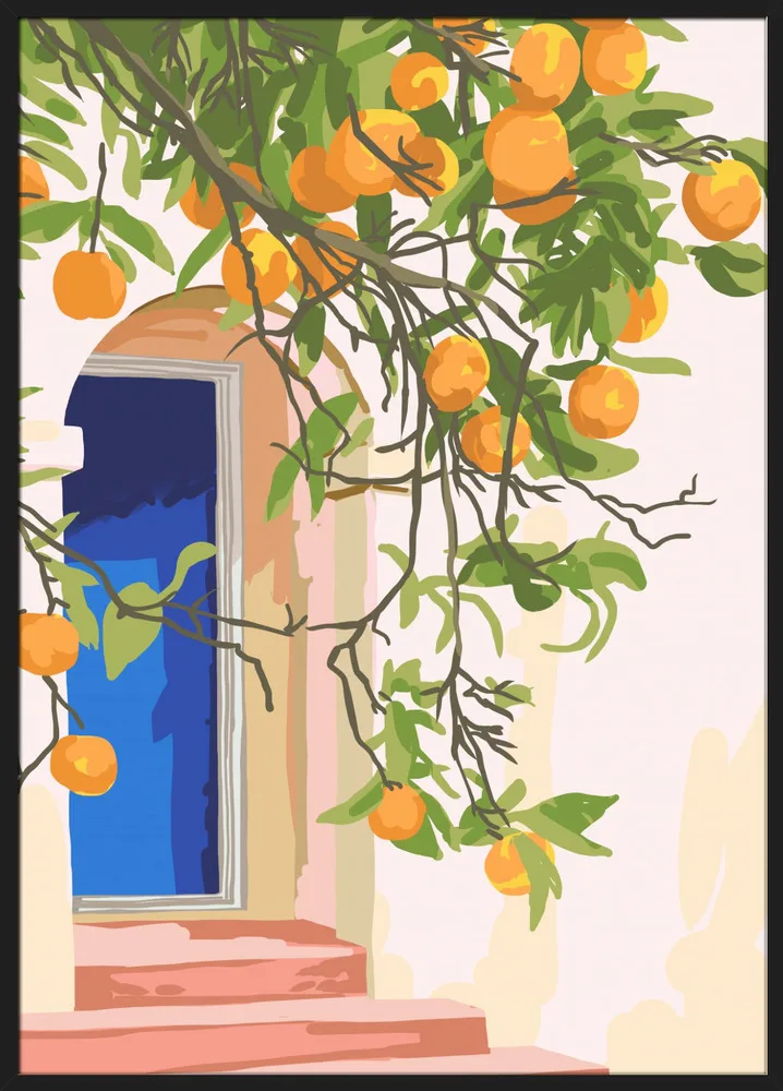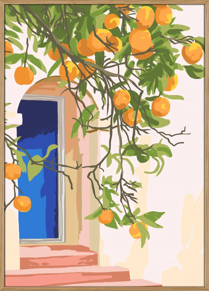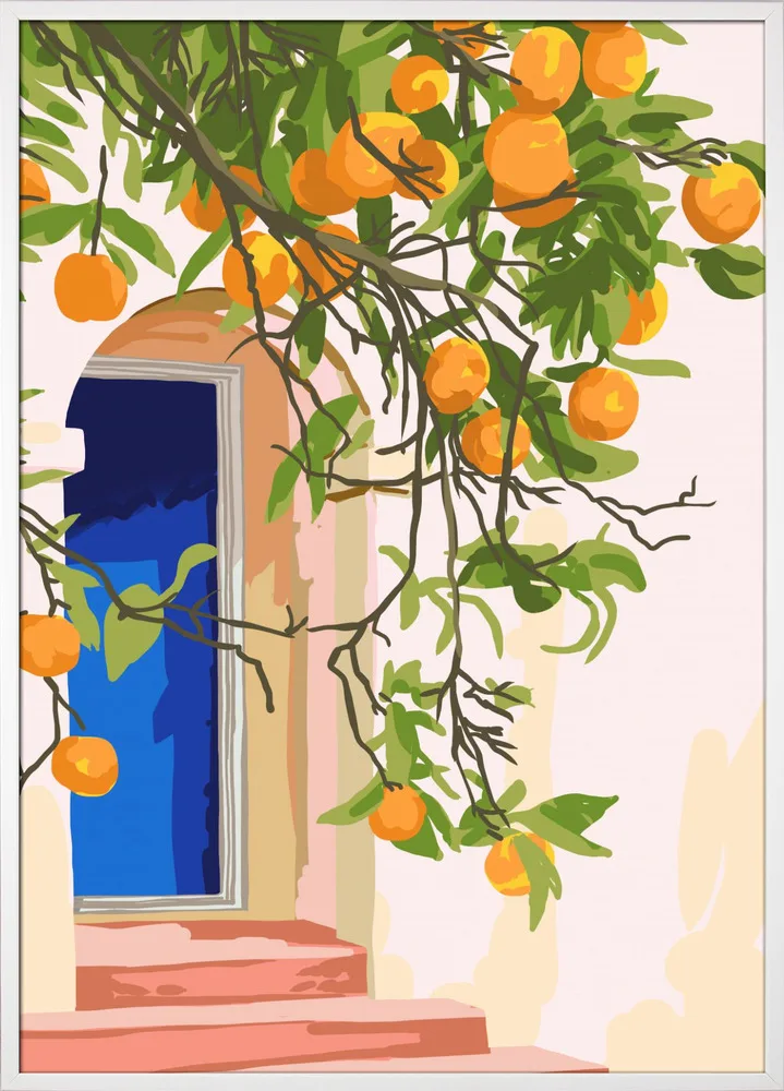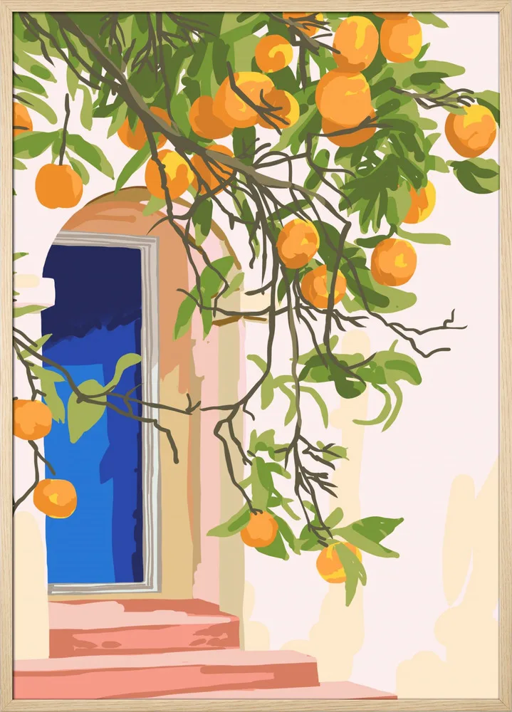 Lyst og sommerligt motiv af Uma Gokhale med appelsintræer og døråbning i sollys. Et varmt og opløftende billede.