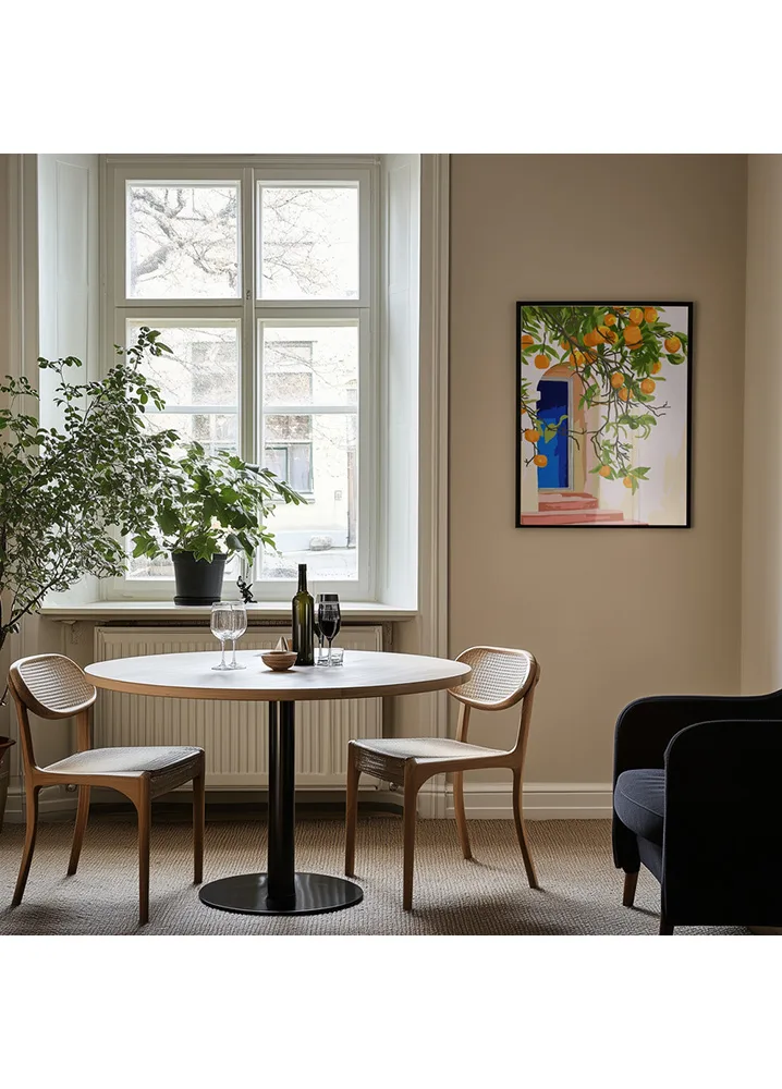 I Wherever You Go, Go With All Your Heart fanger Uma Gokhale den sydlandske stemning. Et appelsintræ slynger sig foran en blå dør i gyldent sollys. Kombinationen af grøn, blå og okker skaber en livlig og varm atmosfære. Motivet passer perfekt i køkken, stue eller sommerhus og minder os om at følge hjertet – og solen.