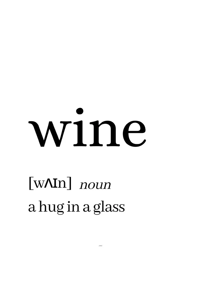 Elegant typografisk plakat med definitionen af Wine: A hug in a glass. Et enkelt og charmerende design.