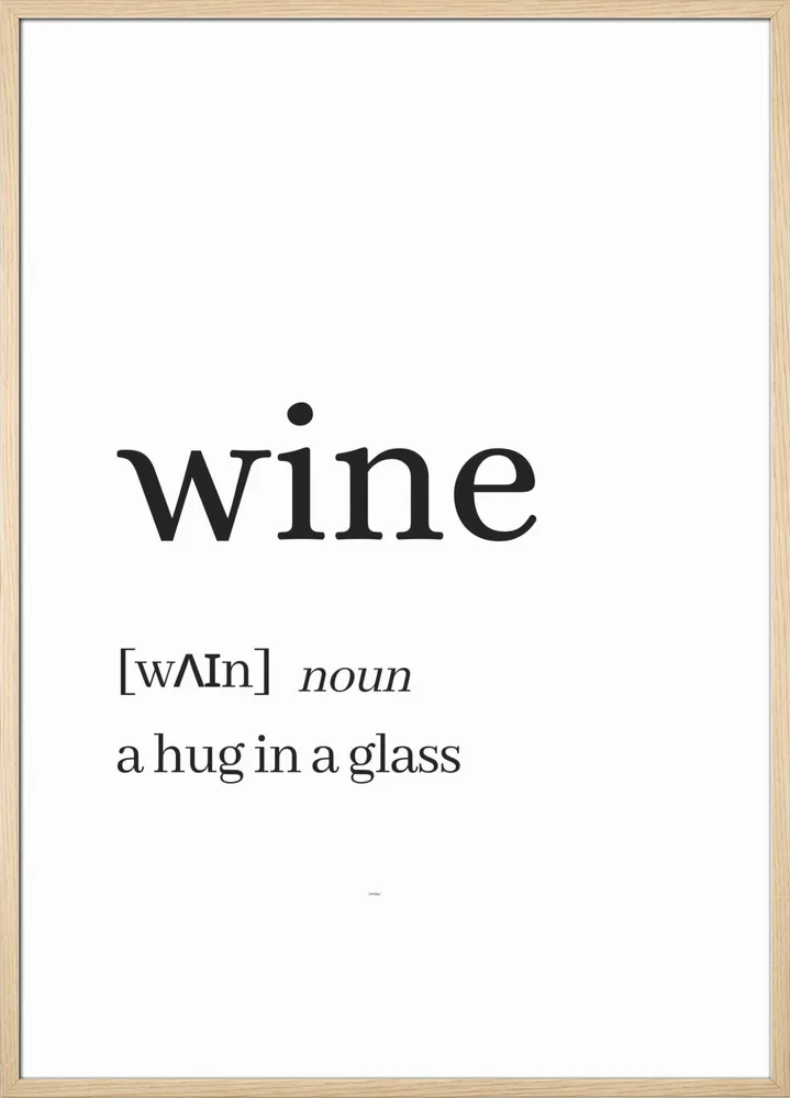 Wine Noun af Kristina N. kombinerer elegance og humor i en enkel sort-hvid tekstplakat. Den minimalistiske definition gør den både sofistikeret og sjov – perfekt til vinelskeren med stil. Stilen er klassisk og passer til både moderne og traditionelle hjem, især i køkken, spisestue eller vinbar.