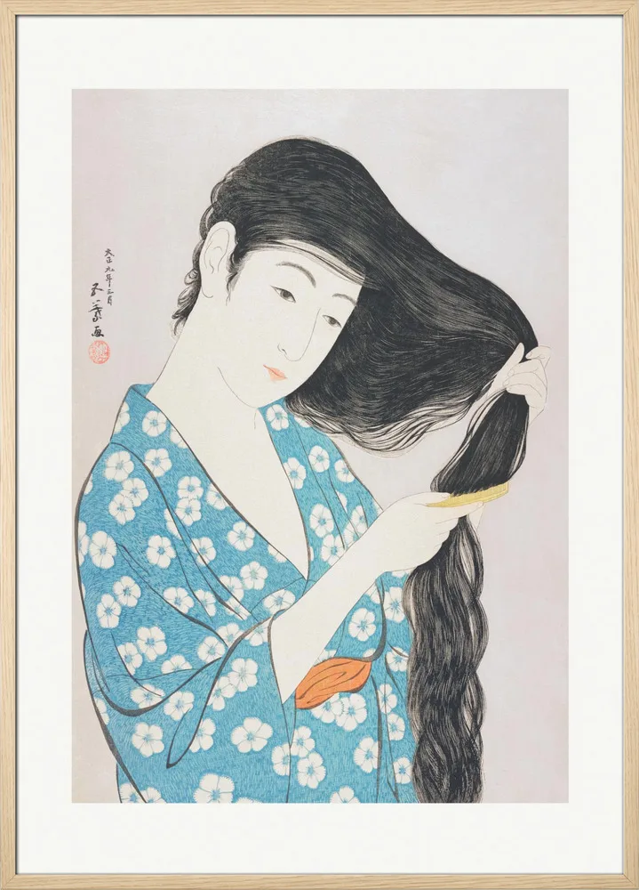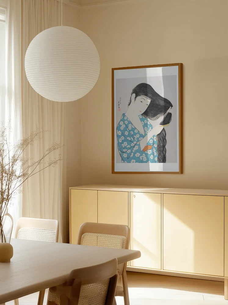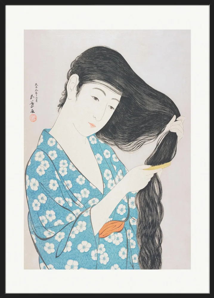 Woman Combing Her Hair (1920) af Hashiguchi Goyo er et mesterværk fra den japanske shin-hanga-periode. Kvindens rolige bevægelse og de bløde linjer i hendes kimono formidler ynde og harmoni. De afdæmpede farver og naturlige detaljer gør værket tidløst. Plakaten er ideel til soveværelset eller badeværelset, hvor man ønsker et roligt og sofistikeret udtryk.