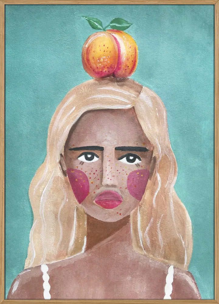 Portræt af kvinde med fersken på hovedet. Et humoristisk og kunstnerisk motiv i blå og orange toner.